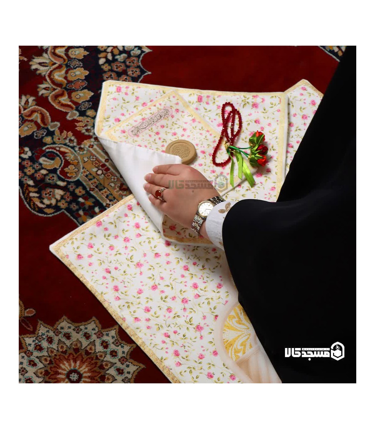 این سجاده با زمینه صورتی کمرنگ و گل های سرخ بسیار زیبا طراحی شده است.