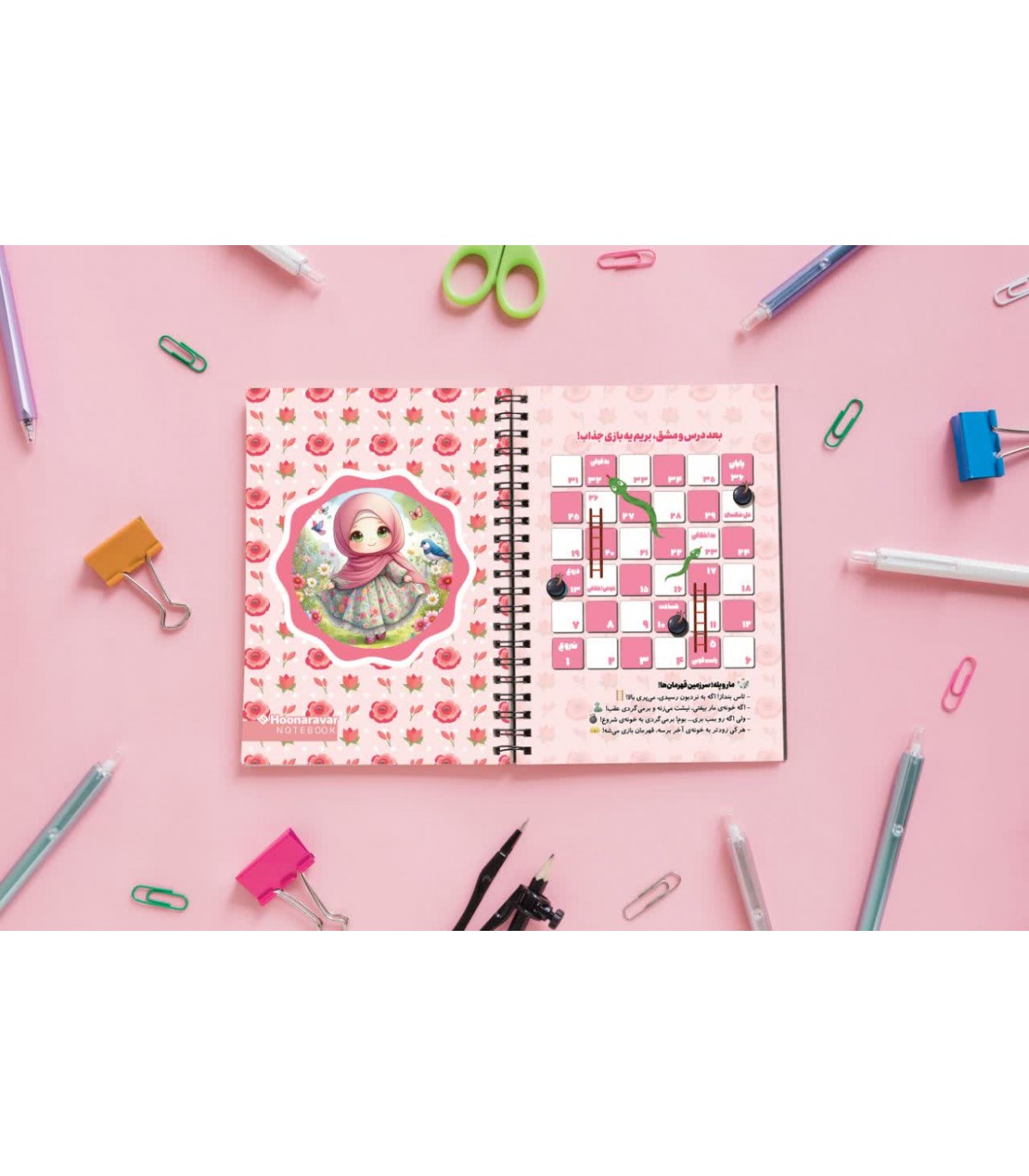 دفتر 50 برگ خطدار با جلد 250 گرم سلفوندار، فنر دوبل، بستهبندی تک سلفون و همراه با مهره بازی و تاس؛ مناسب نوشتن و بازی همزمان.