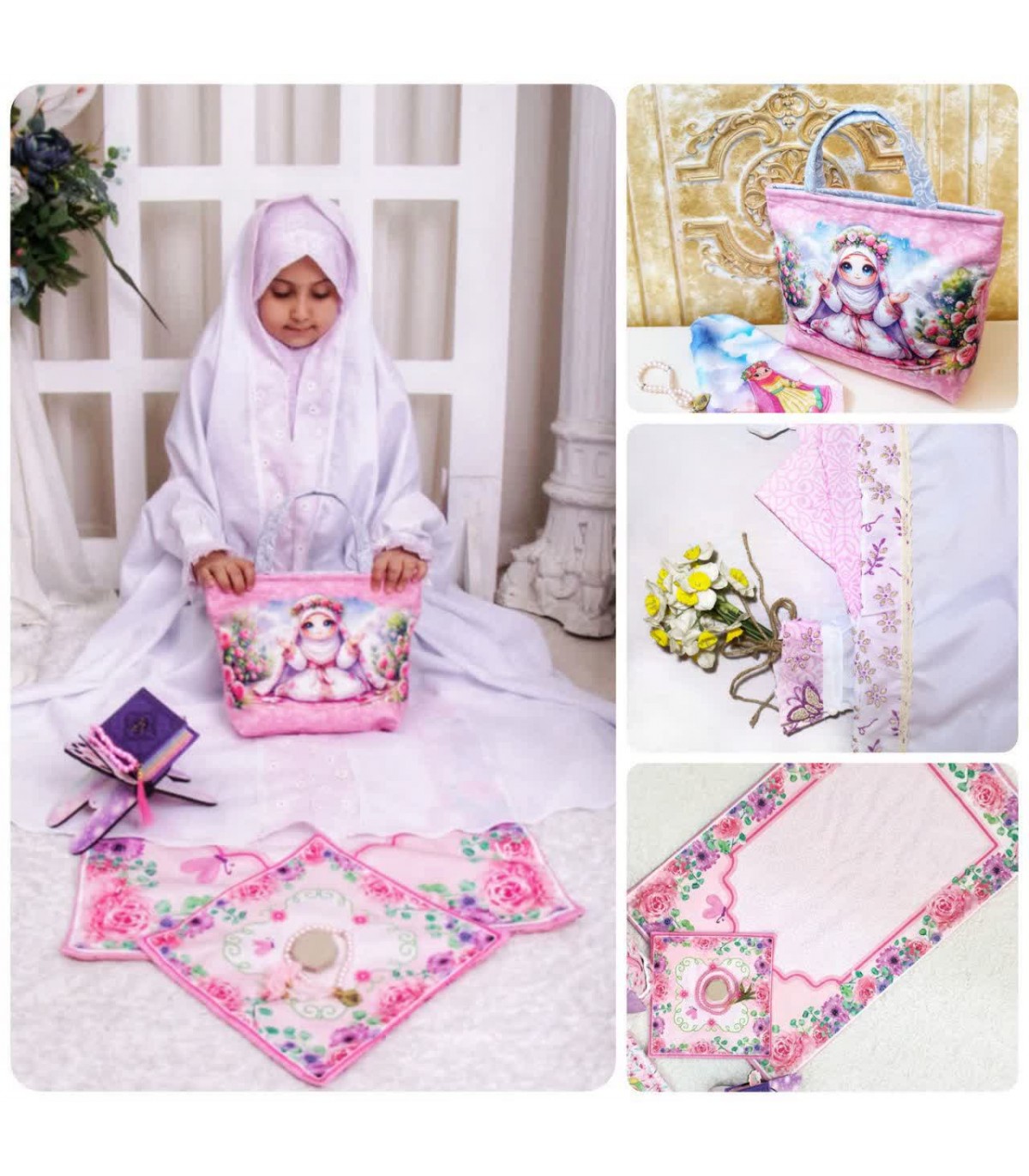 ست اقتصادی هنرآور شامل چادر سفید تور دوزیشده با مقنعه متصل، کیف دستی مخمل چاپدار، سجاده و جانماز مخمل آستردار، بههمراه تسبیح و مهر هدیه — مناسب مدارس، هدیه فرهنگی و استفاده روزمره.