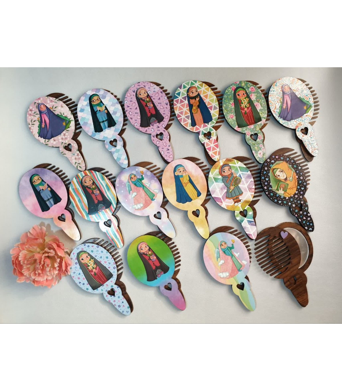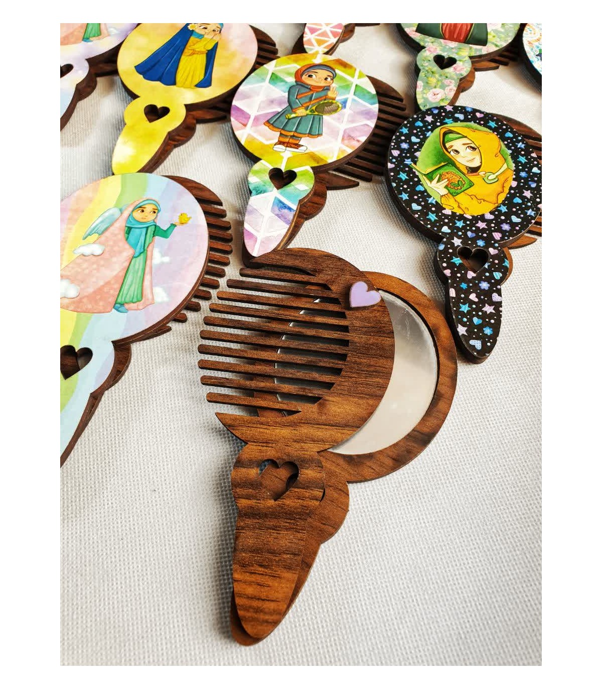 آینه و شانه چوبی دخترانه با طرح‌های متنوع، بسته‌بندی تک‌سلفون و عرضه در بسته‌های ۳۵ تایی — ستی کاربردی و مناسب برای هدیه و فروش عمده.