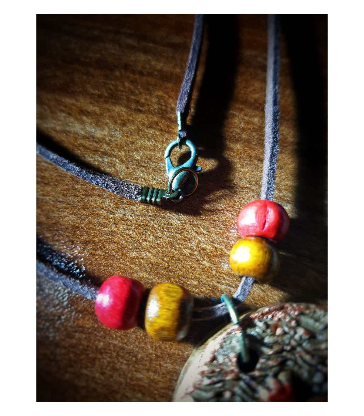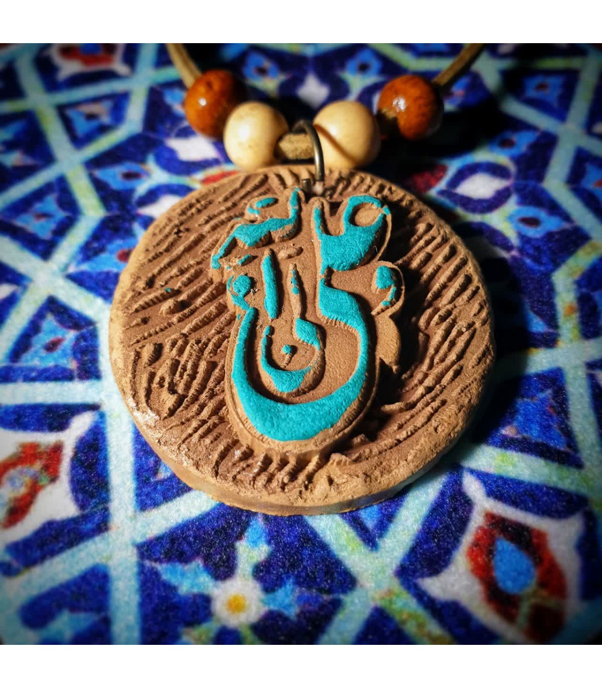 رومانتویی سفالی نقش‌برجسته مزین به نام امیرالمومنین (ع)، بند جیر، قفل طوطی، رنگ‌آمیزی دستی و عرضه در تک‌جعبه.